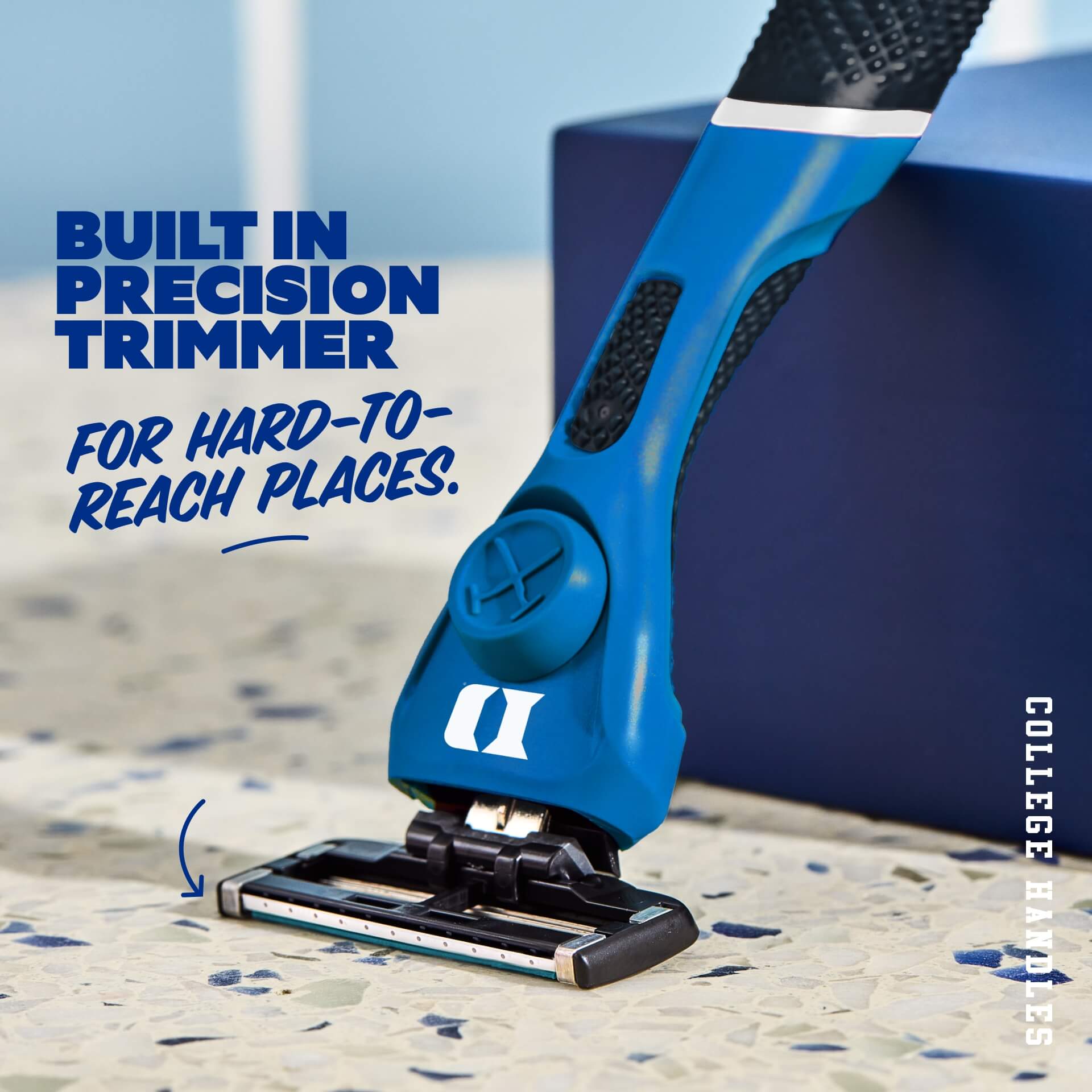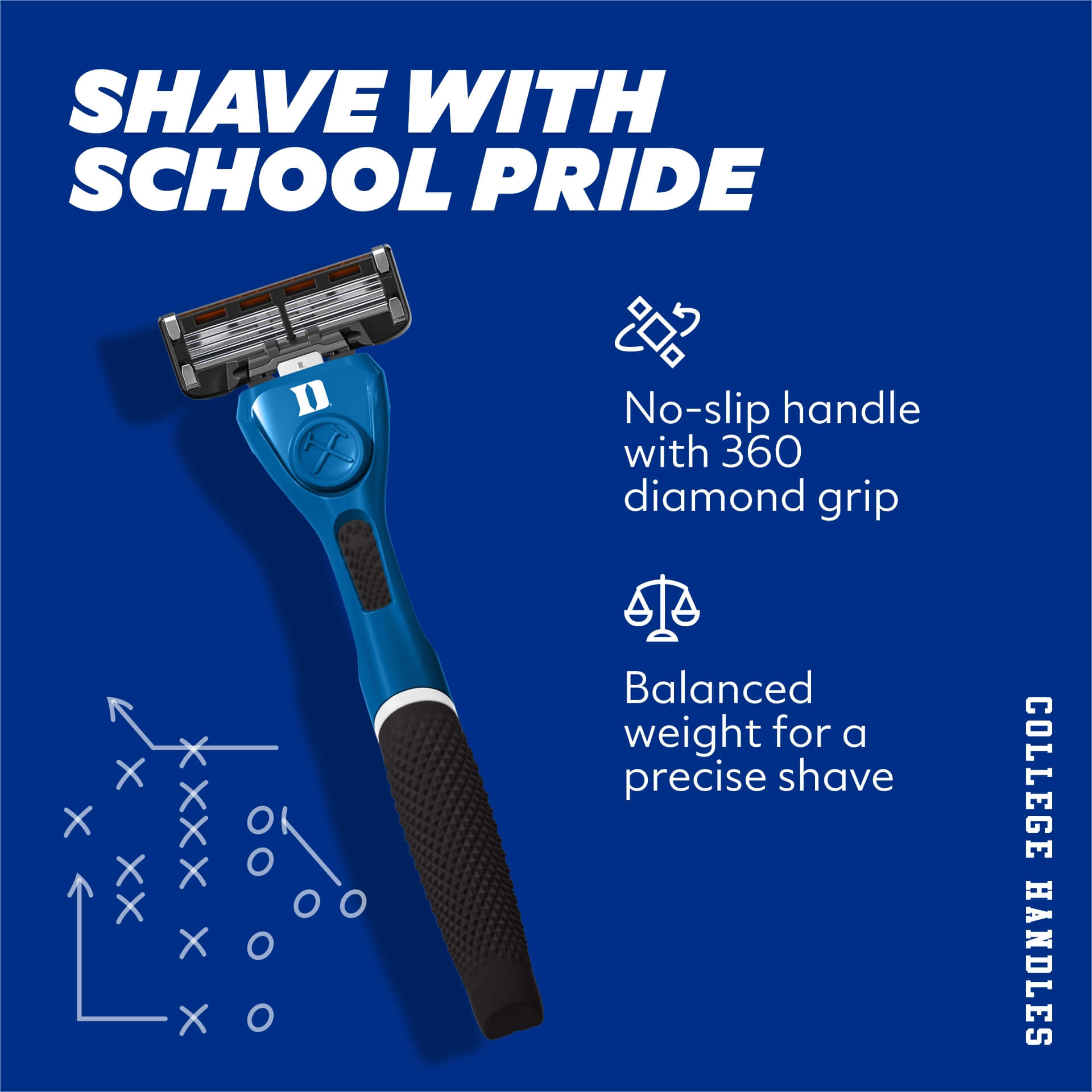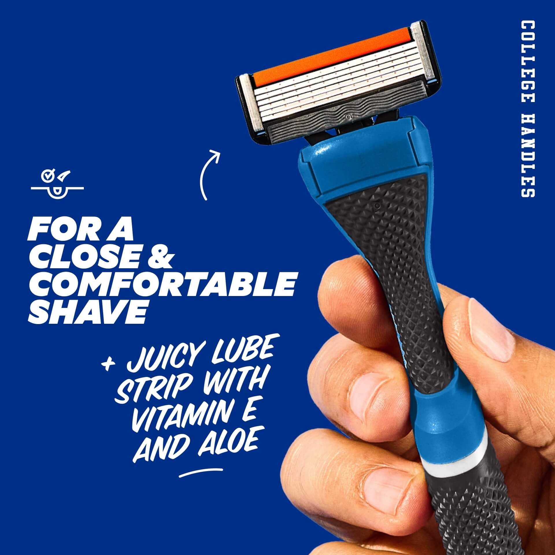 Your team. Your colors. Your face just got smoother with the Limited Edition Gift Set that includes our sturdy Diamond Grip handle repping school colors, two Signature 6 Blade cartridges with a precision trimmer for tricky spots, and a JUICY lube strip infused with Aloe + Vitamin E.