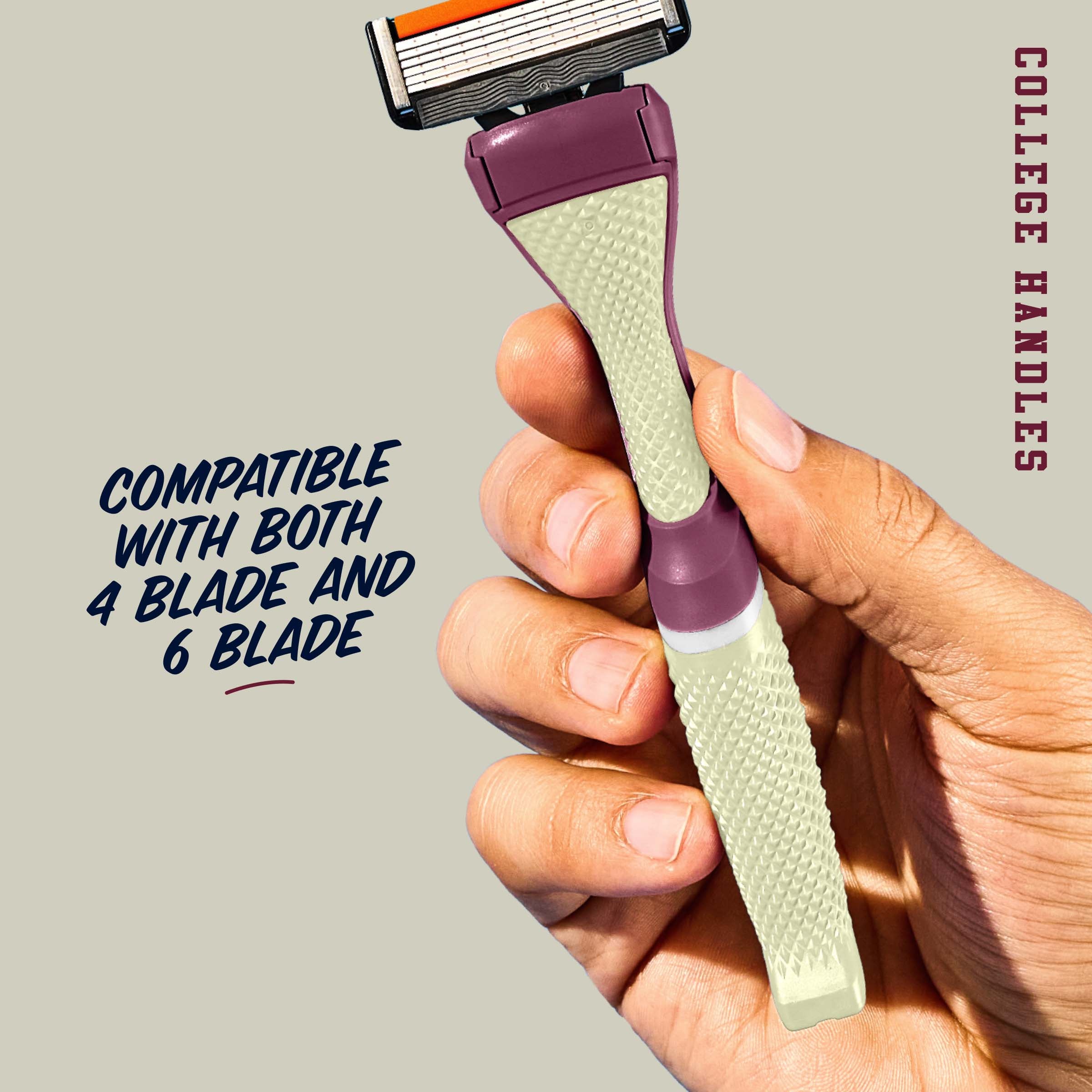 Your team. Your colors. Our limited-edition collegiate handles are built to rep school spirit from the sink to the stadium. Whether you go with our 4 Blade Club Series or 6 Blade Club Series cartridge, both are compatible with this weighty, diamond-patterned grip handle designed for ultimate comfort and control.