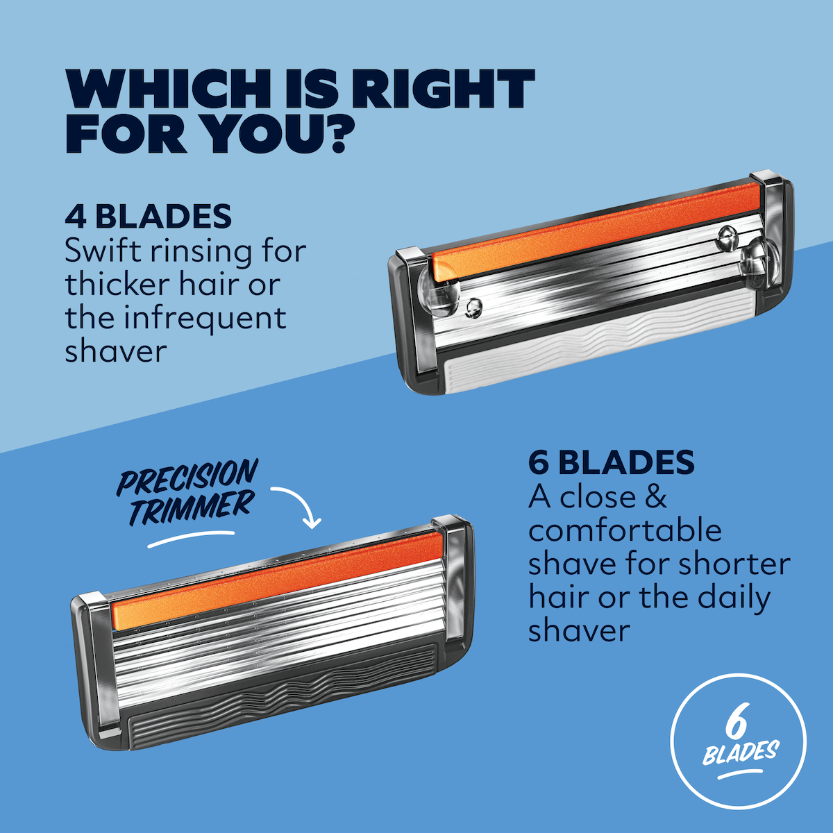 - Six longer-lasting stainless steel blades for our closest, most comfortable shave